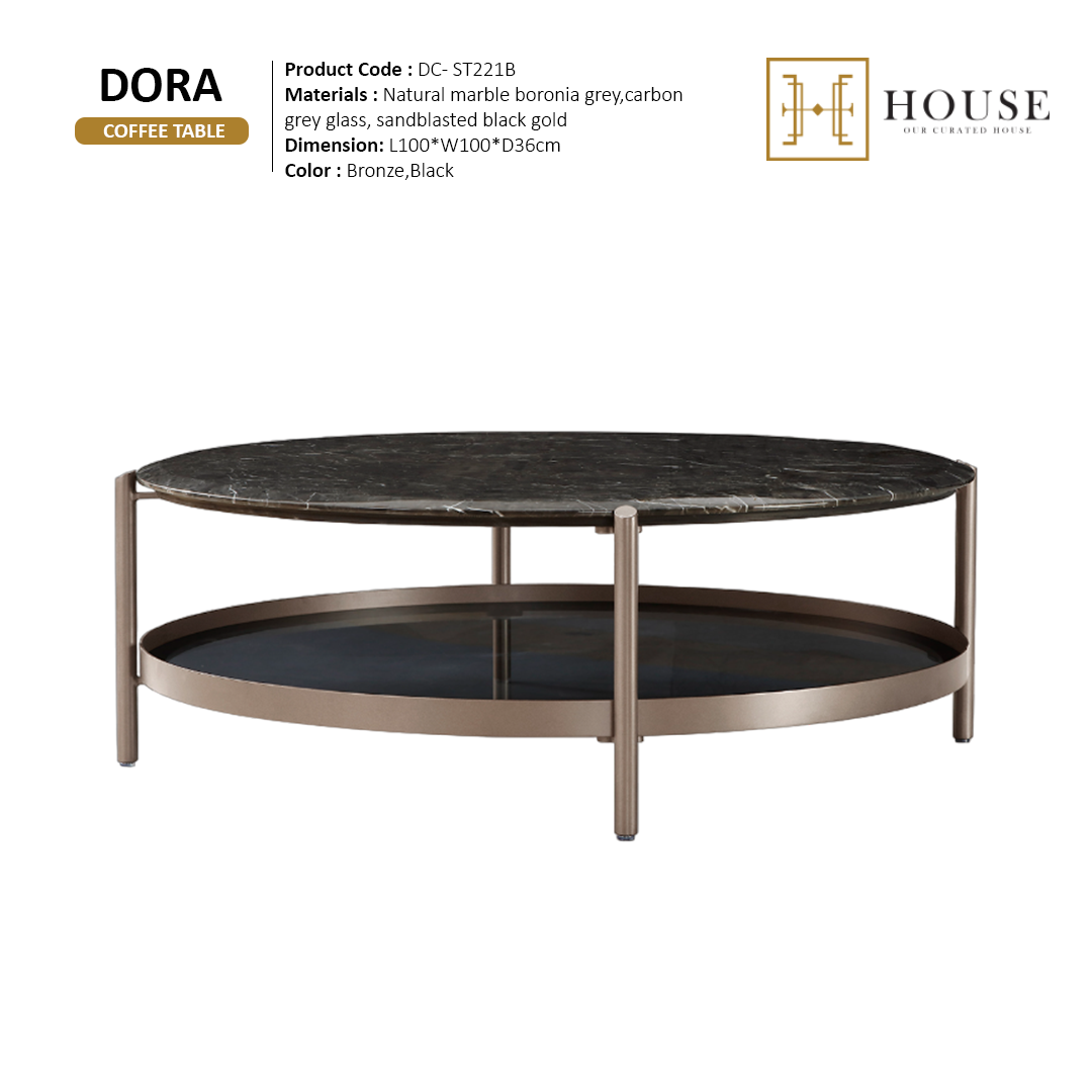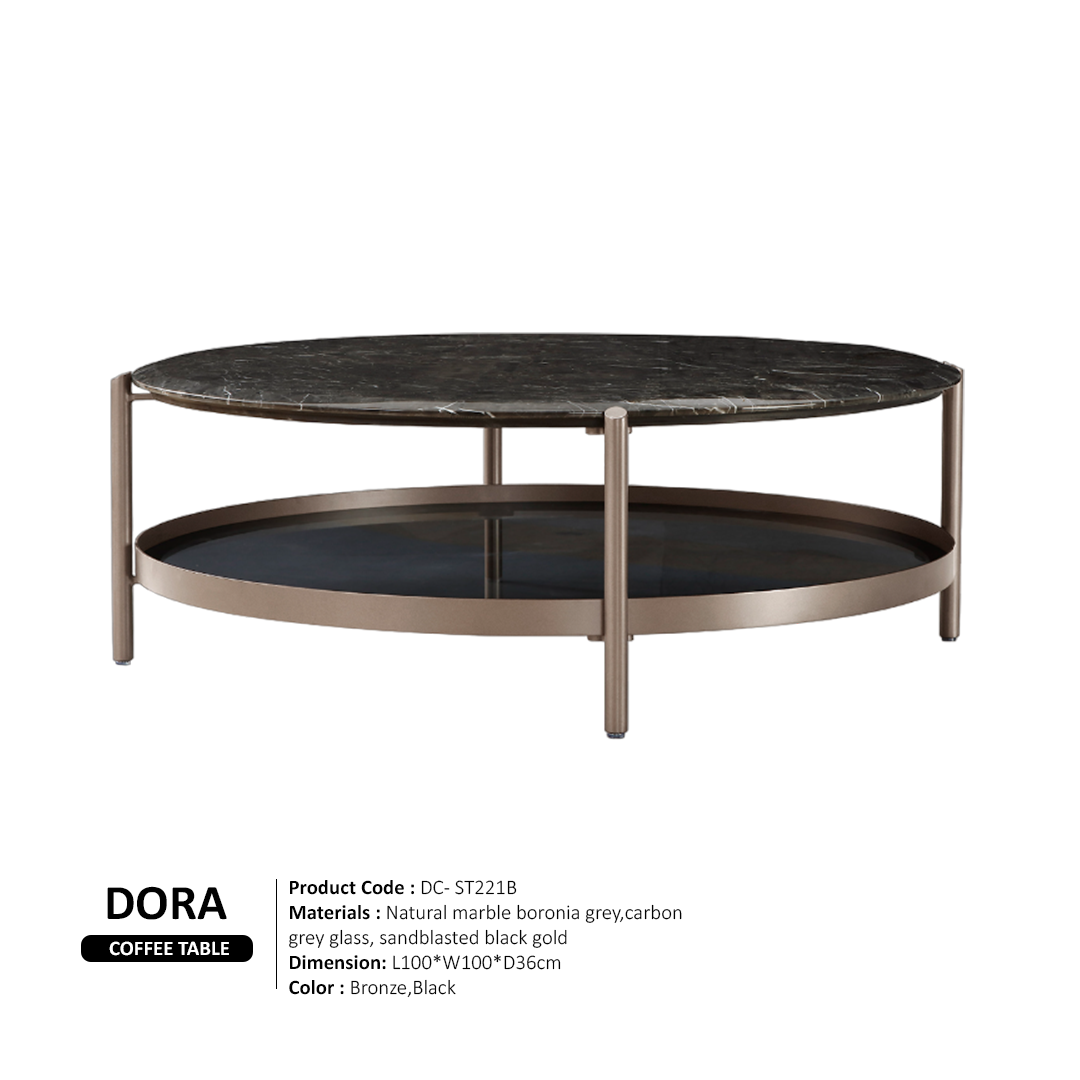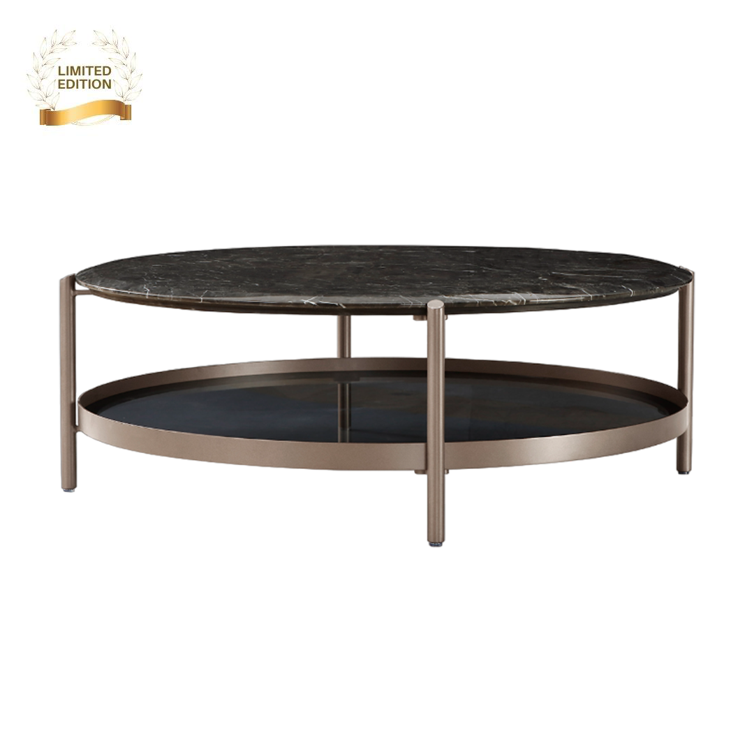 Coffee table, crafted with a natural Boronia grey marble top. The sleek carbon grey glass elements add modern sophistication, while the sandblasted black gold finish on the base offers a luxurious and striking contrast. This table combines durability with exquisite style, making it a centerpiece in any contemporary setting.