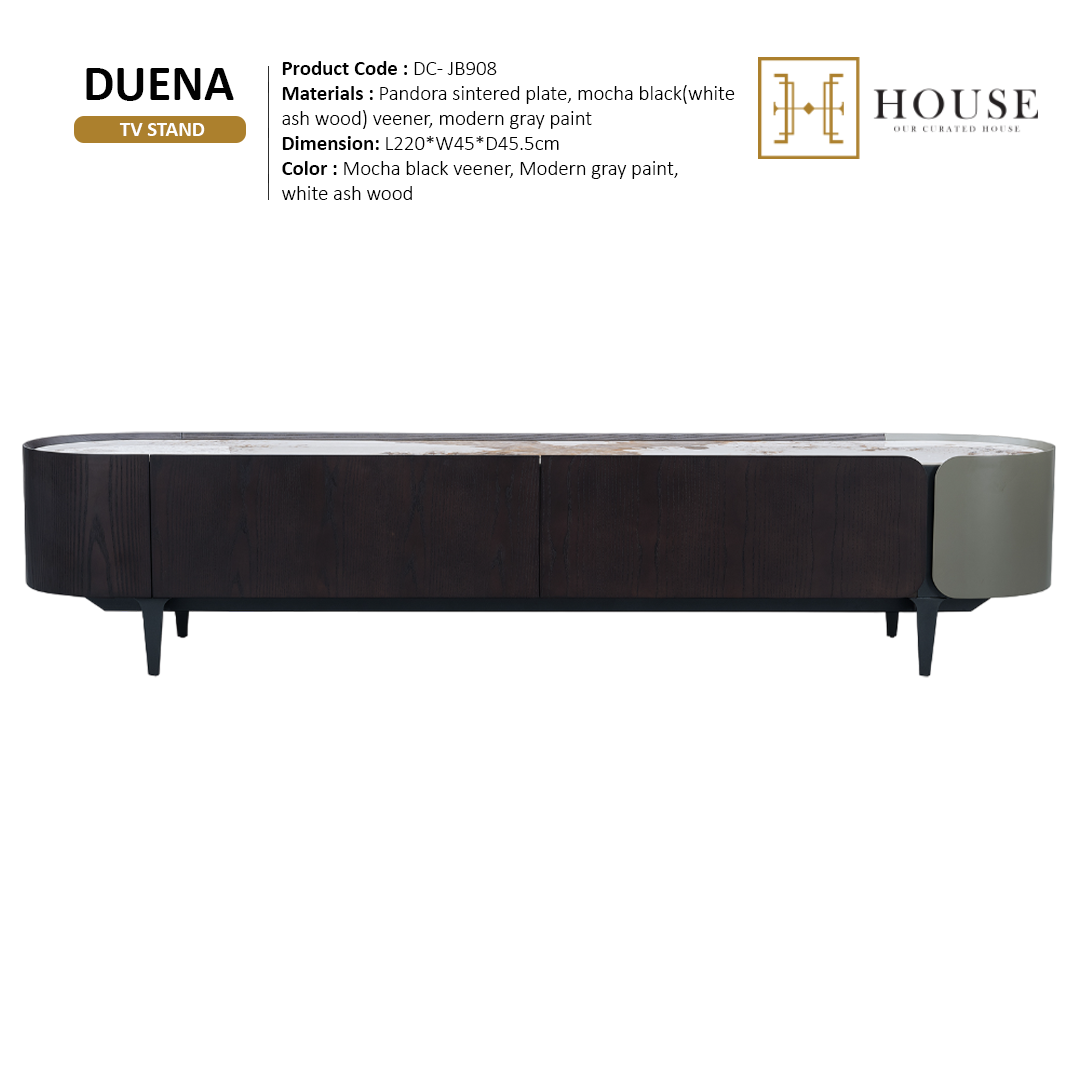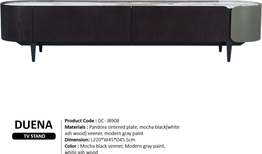 This sleek and modern table combines Pandora sintered plate, mocha black veneer, and a contemporary gray paint finish. The striking blend of materials creates a sophisticated, durable design perfect for any modern space.