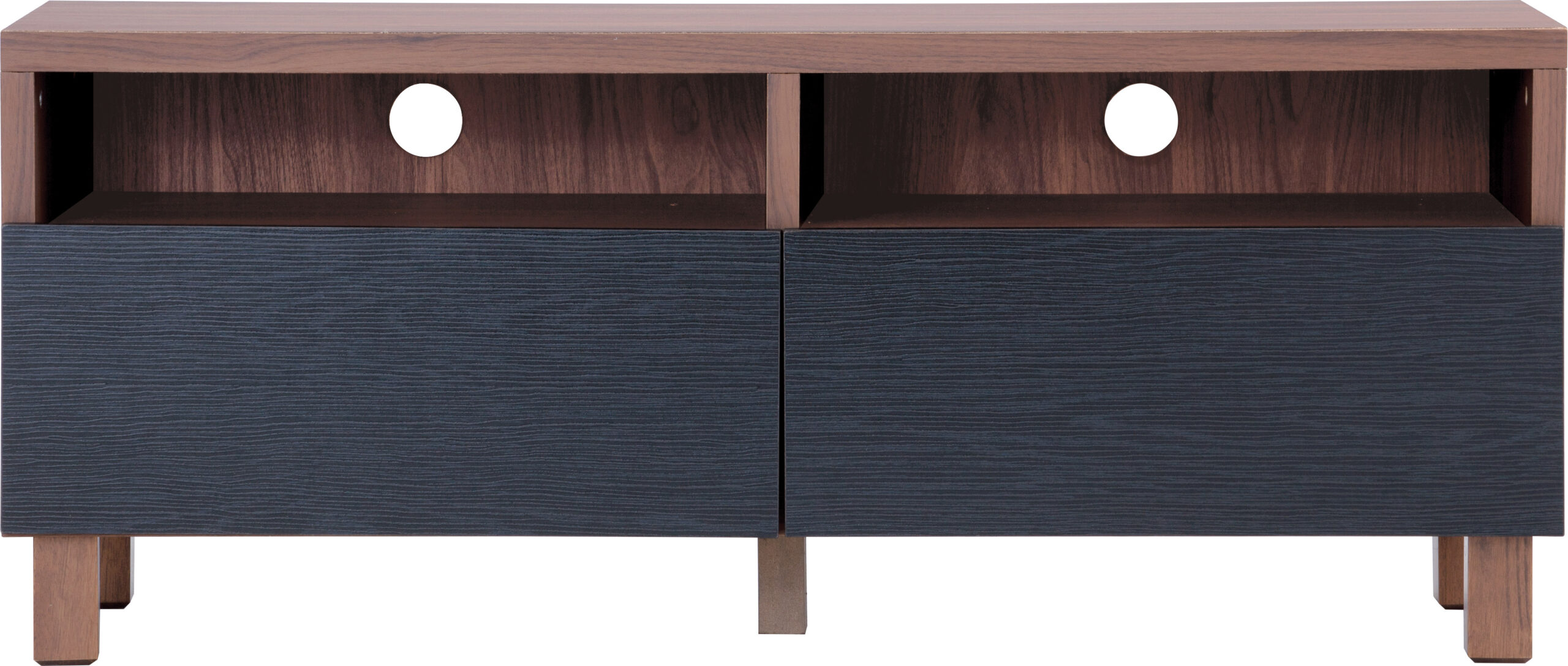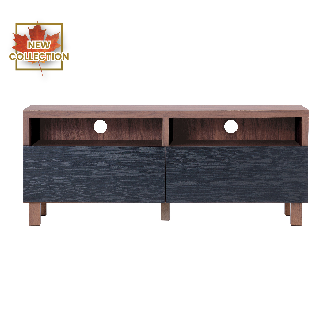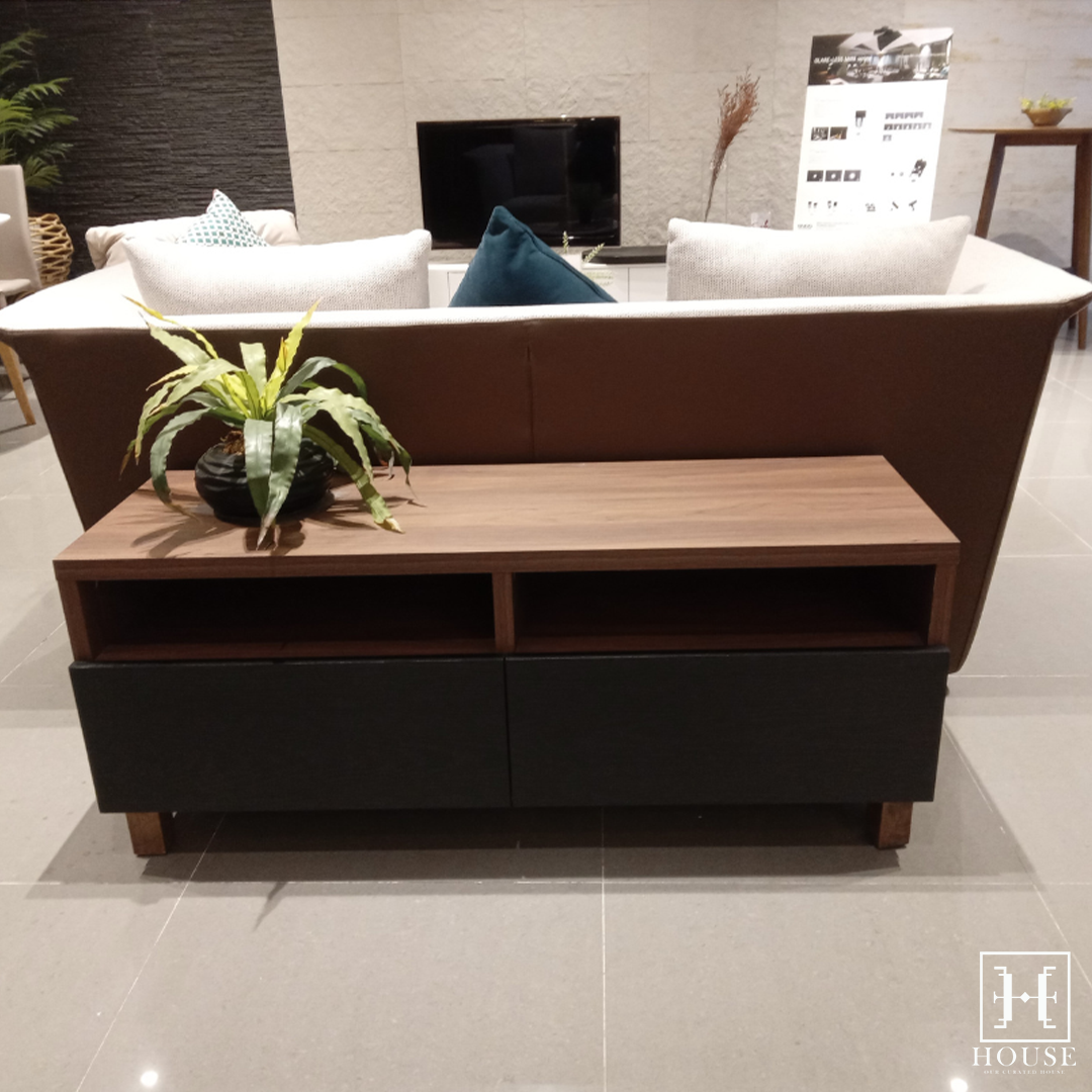 Modern TV Cabinet with a sleek combination of materials. The Malaysian oak legs in a rich cocoa finish provide sturdy support, while the laminated board frame in walnut adds warmth and sophistication. The black doors offer a bold contrast, completing the piece with a touch of elegance. Perfect for contemporary living rooms, this cabinet combines functionality with style, offering both storage and a striking visual appeal.