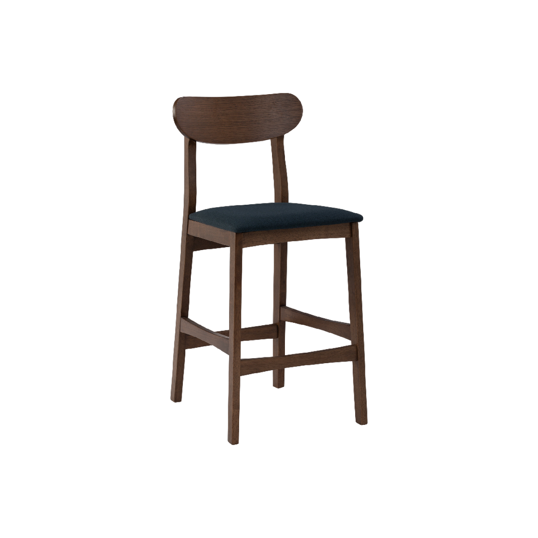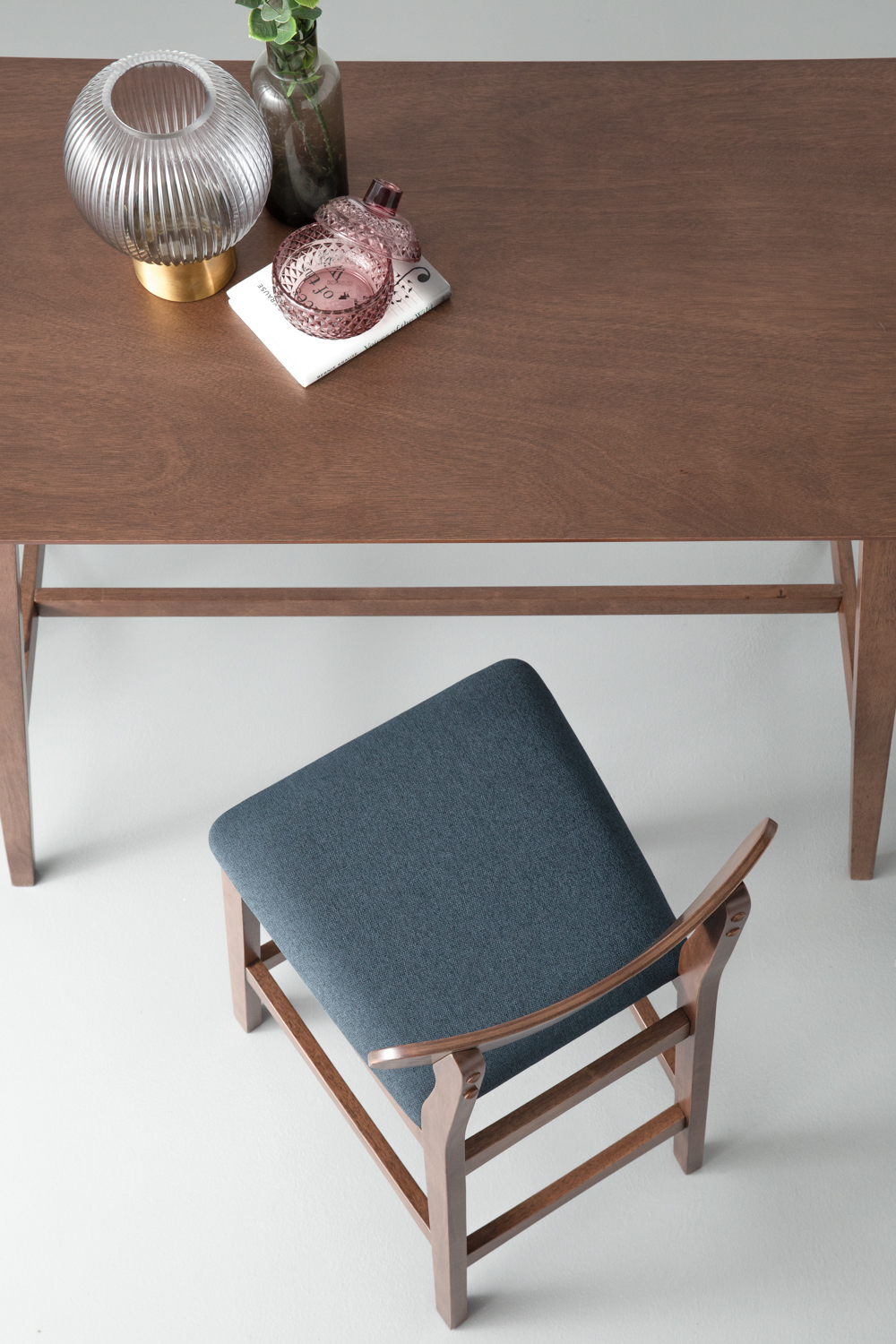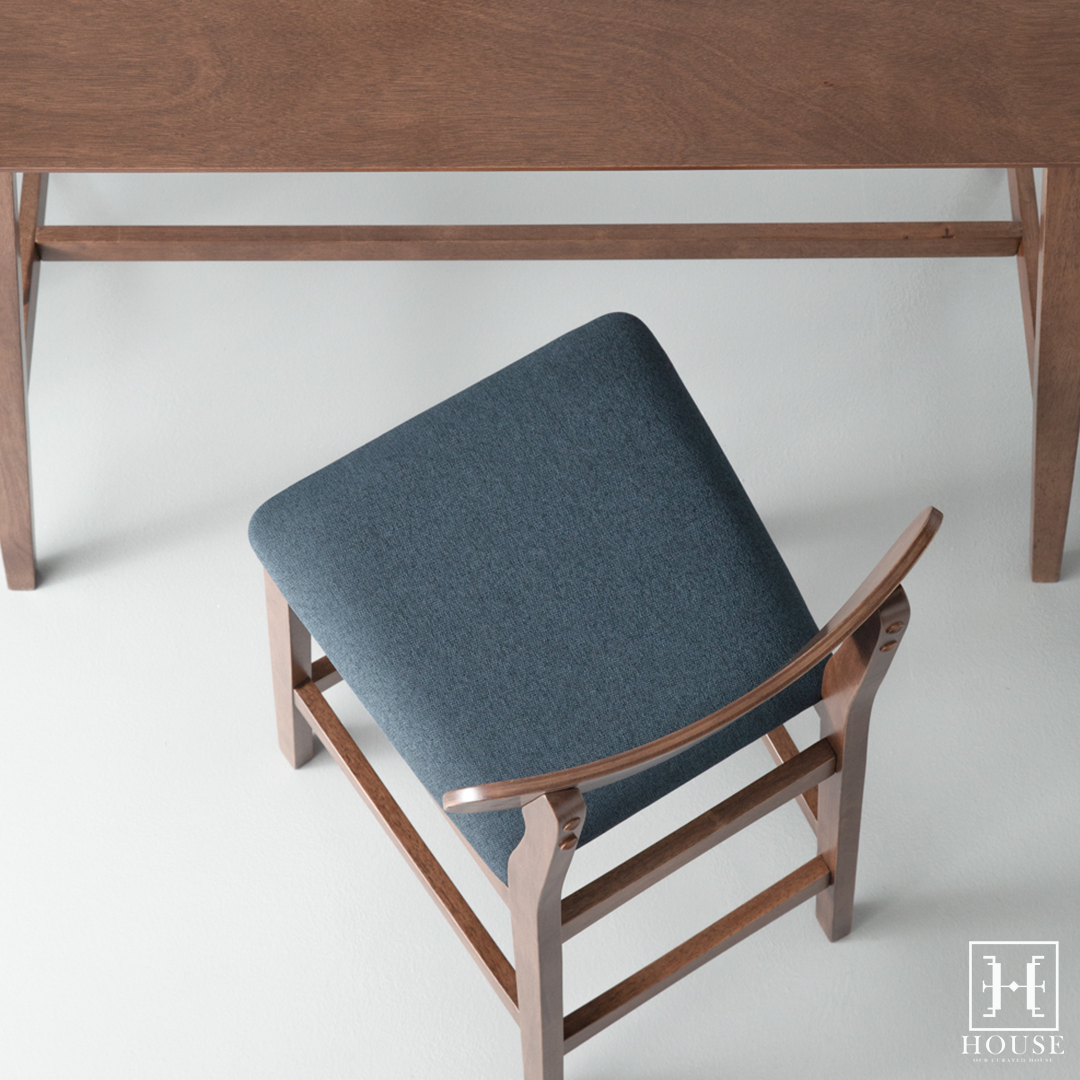Chic Dining Chair with Malaysian oak legs finished in a rich cocoa tone (109 Cocoa). The chair features a combination of veneer and soft Challis fabric for the seat, offering both comfort and style. The deep navy fabric (6367 Navy) adds a pop of color, making this chair a sophisticated and modern addition to any dining room.