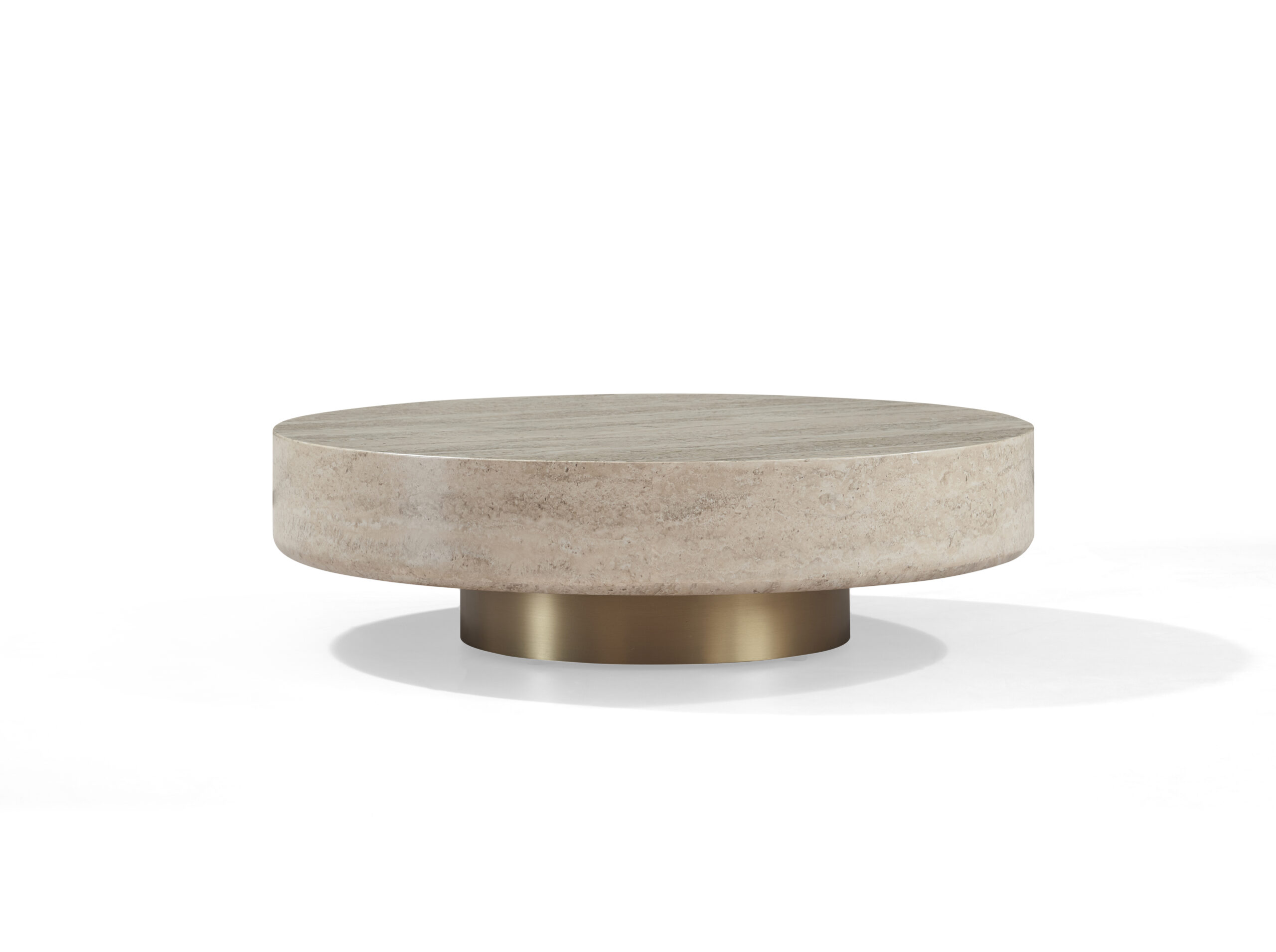 Designed with a wide, low silhouette, this table combines the visual weight of stone with the practicality of wood. It features a wooden top expertly coated in a faux-marble finish, resting on a durable stainless steel base for a sophisticated, contemporary look.