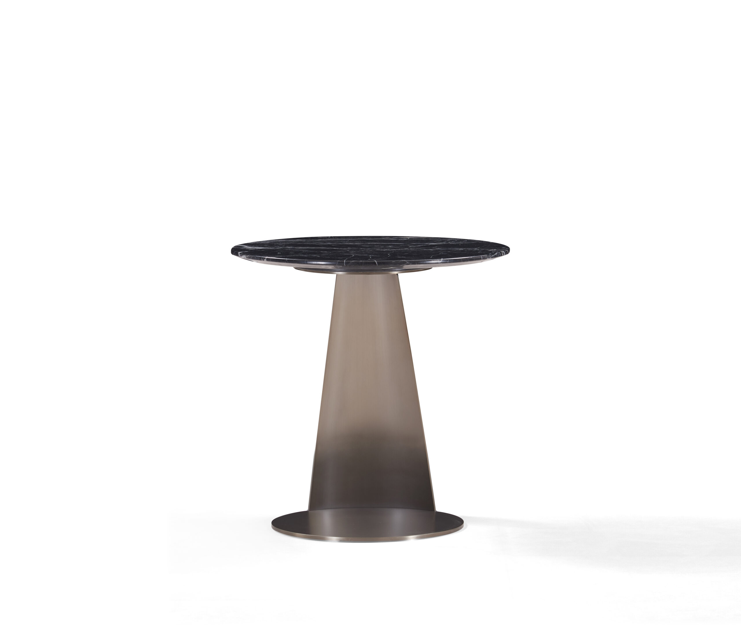 Minimalist yet bold, this side table features a premium marble top with a specialized “Bulgari” finish, known for its distinct character. The stone is elevated by a simple, polished stainless steel base, allowing the natural beauty of the marble to take center stage.