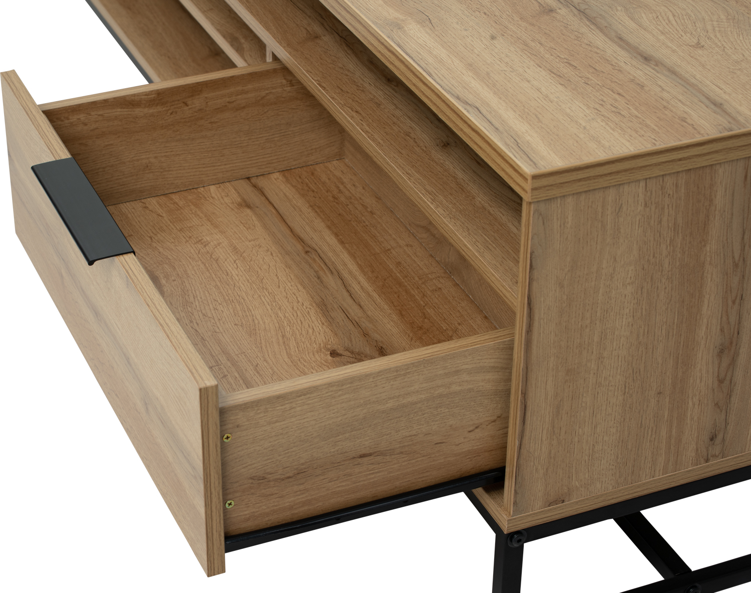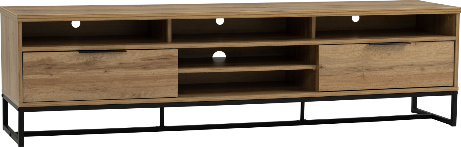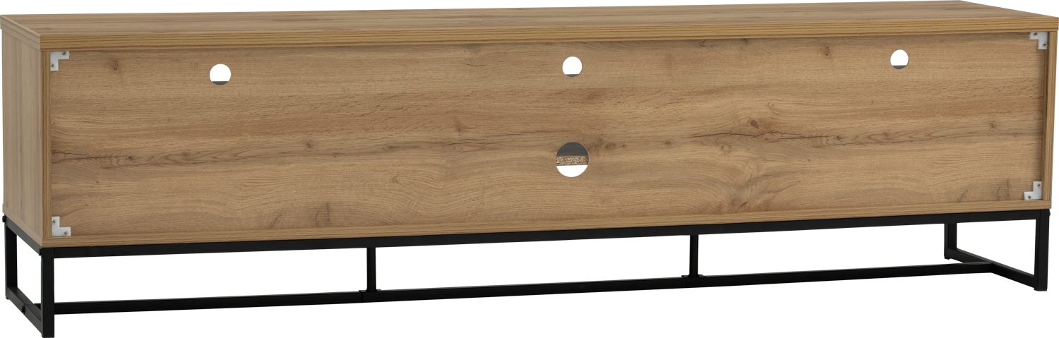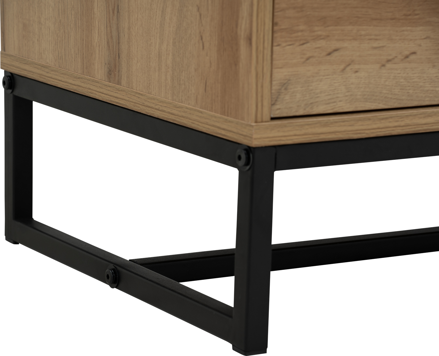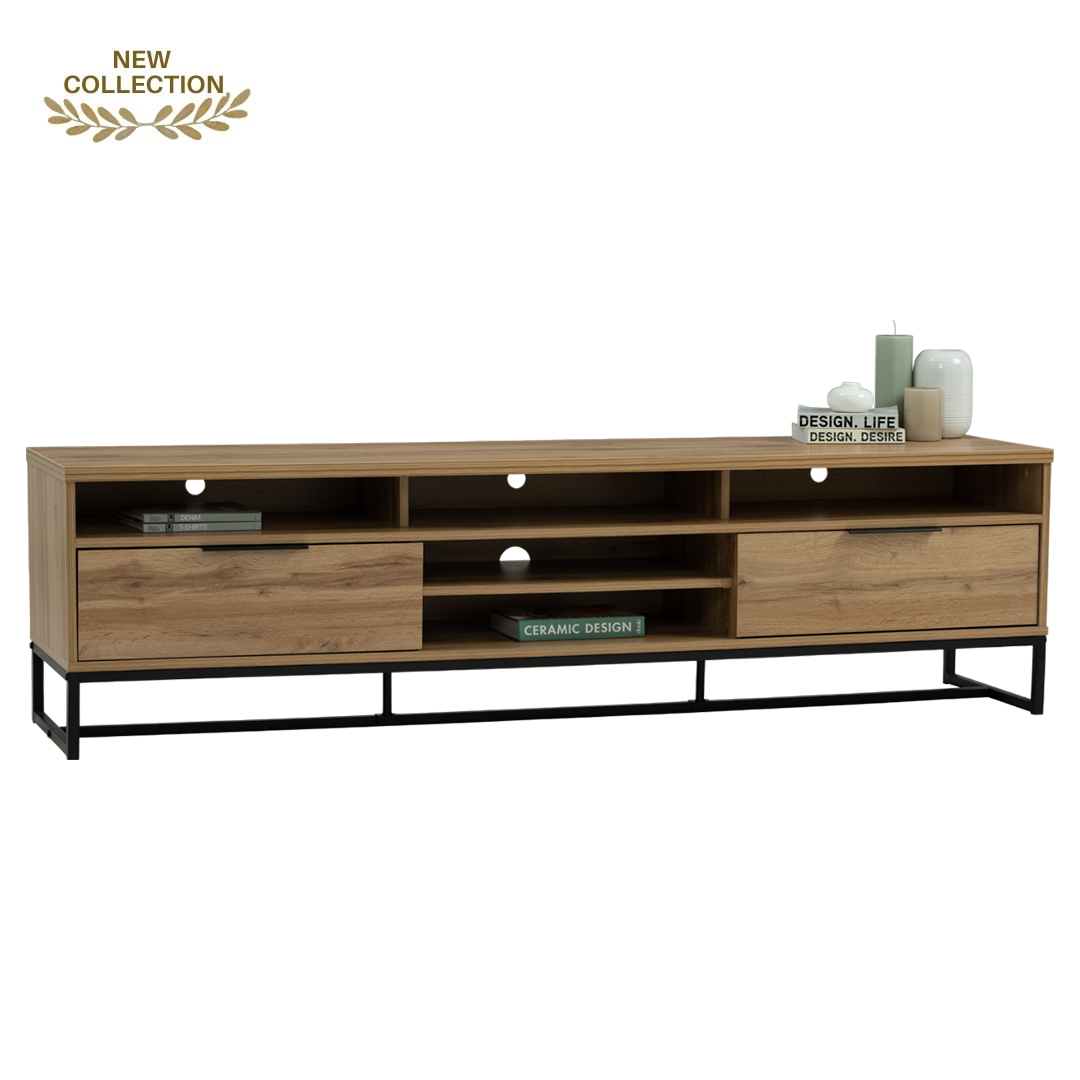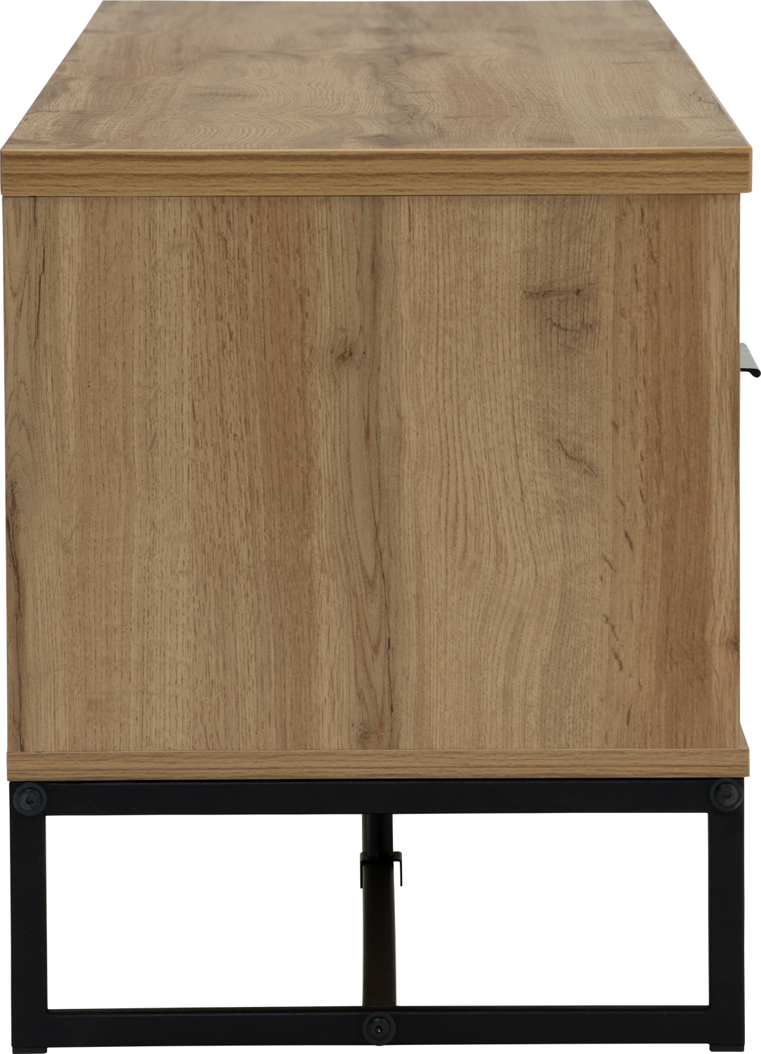 Modern TV Cabinet featuring sleek matte black epoxy legs (802 Matt Black Epoxy) that provide a sturdy and minimalist foundation. The 179 Wotan Oak frame adds warmth and texture, creating a perfect balance between industrial and natural elements. This TV cabinet offers both style and functionality, making it a versatile piece for contemporary living rooms.